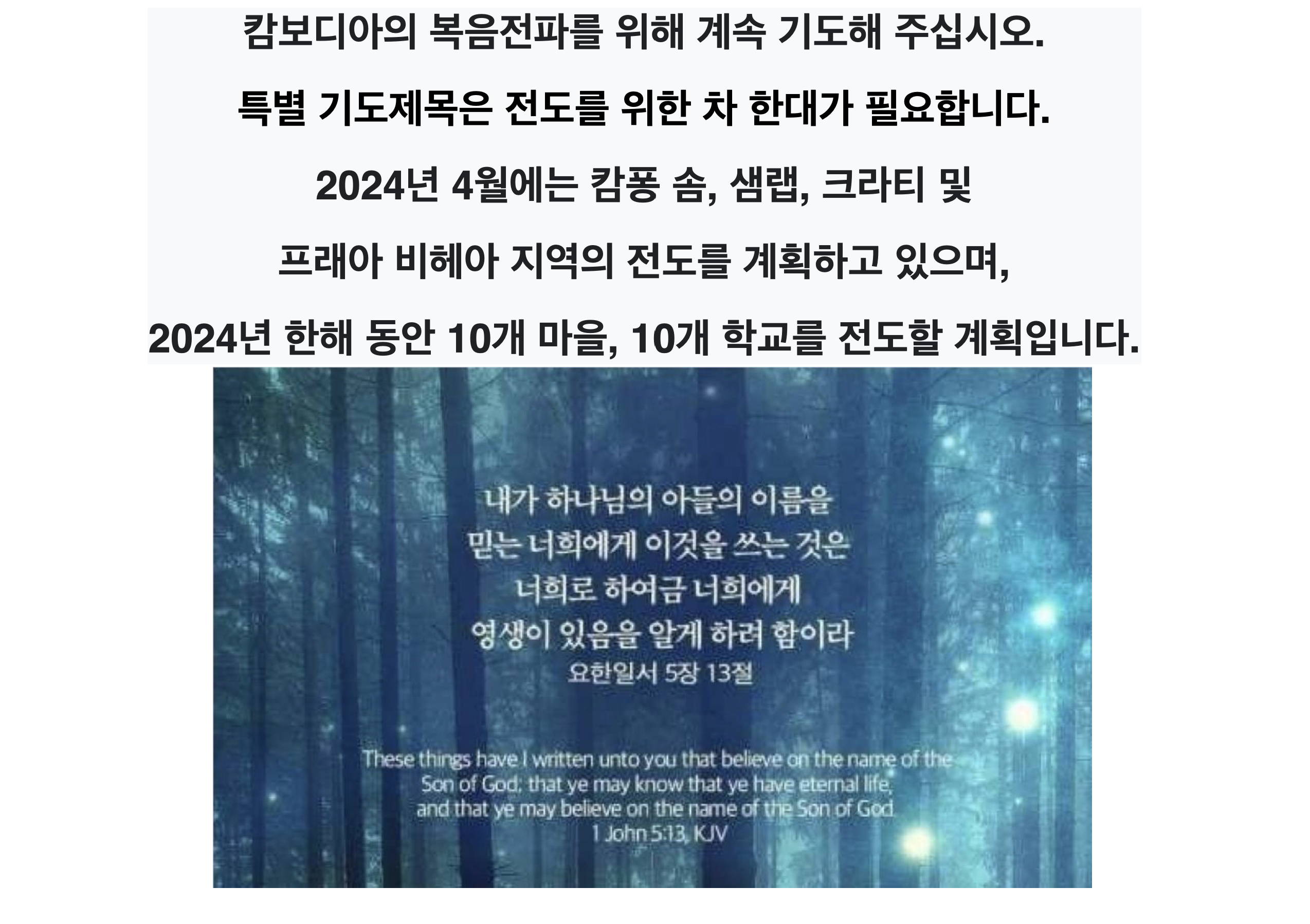 캄보디아의 복음전파를 위해 계속 기도해 주십시오. 특별 기도제목은 전도를 위한 차 한대가 필요합니다. 2024년 4월에는 캄퐁 솜, 샘랩, 크라티 및 프래아 비헤아 지역의 전도를 계획하고 있으며, 2024년 한해 동안 10개 마을, 10개 학교를 전도할 계획입니다.