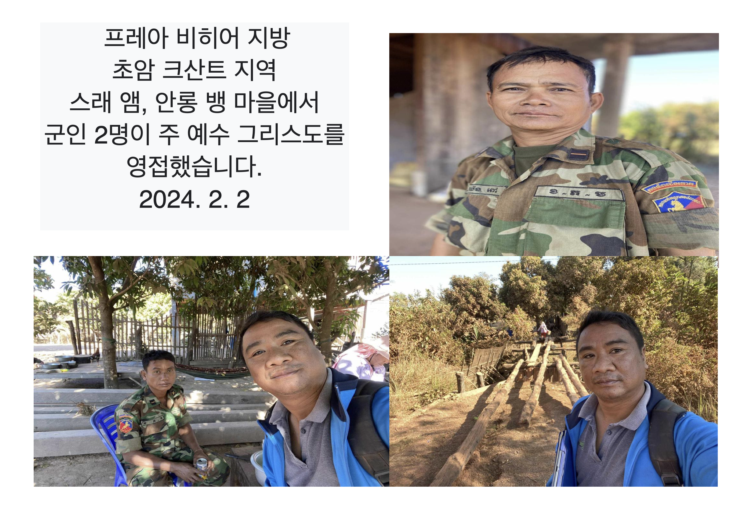 프레아 비히어 지방 초암 크산트 지역 스래 앰, 안롱 뱅 마을에서 군인 2명이 주 예수 그리스도를 영접했습니다. 2024.2.2