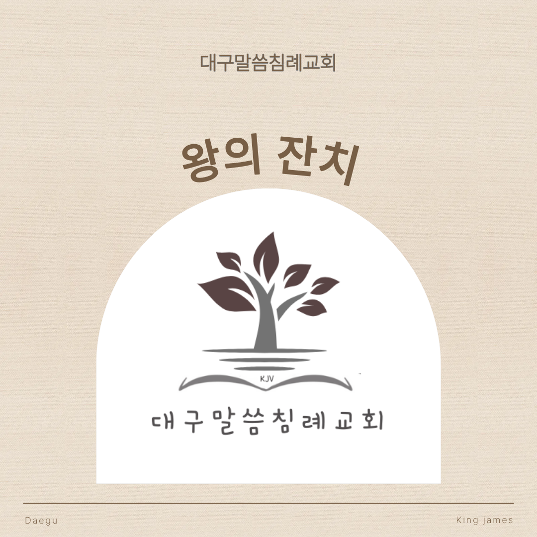 대구말씀침례교회 주일 설교왕의 잔치 (에스더기 1장 1절-5절)본문 말씀: 에스더기 1장 1-5절1 이제 아하수에루스의 날들에 이러한 일이 있었으니, (이 사람은 인도부터 에티오피아에 이르기까지 일백이십칠 개의 지방들을 통치한 아하수에루스니라.)2 그 당시 아하수에루스왕이 슈샨궁 안에 있던 그의 왕국의 보좌 위에 앉았던 때인3 그의 통치 제삼년에 그가 그의 모든 통치자들과 그의 종들에게 잔치를 열었더라. 페르시아와 메디아의 권세와 귀족들과 속주들의 통치자들이 그의 앞에 있더라.4 그는 그의 영광스러운 왕국의 재물들과 그의 탁월한 존엄의 영예를 여러 날들 동안, 곧 일백팔십 일 동안 내보였더라.5 그리고 이 날들이 다 찼을 때 왕이 큰 자, 작은 자 할 것 없이 슈샨궁에 참석해 있던 모든 백성에게 왕의 궁..