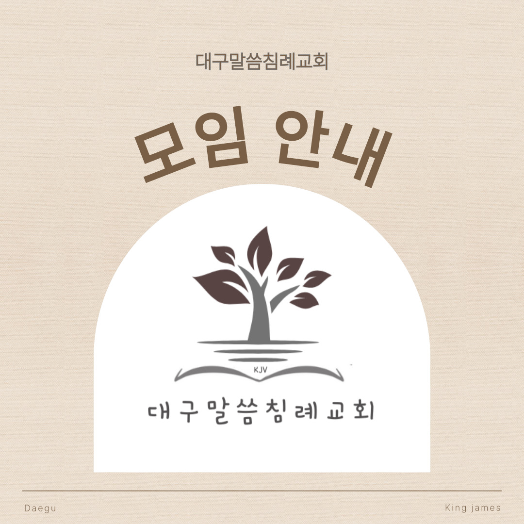 [대구말씀침례교회] 모임 안내 주의 첫 날 (주일)주일 성경 공부오전 10:00 ~ 10:40어린이 주일 학교오전 10:00 ~ 10:40주일 예배오전 11:00 ~ 12:20 토요일 모임성경 공부오후 2:00 ~ 3:00중보 기도오후 3:00 ~ 3:30길거리 전도오후 3:30 ~ 대구말씀침례교회/모임 안내 2025.02.18