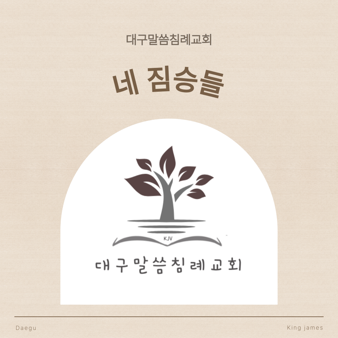대구말씀침례교회 토요 성경공부하나님의 인장 (요한계시록 7장 1절-4절) “그리고 이 일들이 있은 후에 내가 땅의 네 모퉁이 위에 서 있는 네 명의 천사들을 보았으니, 땅의 네 바람들을 잡아서 바람이 땅 위에도, 바다 위에도, 어떤 나무 위에도 불지 않게 하였더라.”(요한계시록 7장 1절)“이어서 살아 계신 [하나님]의 인장을 지닌 채 동쪽에서부터 또 다른 천사가 올라오는 것을 내가 보았도다. 그러자 그가 네 명의 천사들에게 큰 목소리로 외쳤으니, 땅과 바다를 손상시키도록 권능이 그들에게 주어졌더라.”(요한계시록 7장 2절)“첫째 천사가 나팔을 울렸더니, 피가 섞인 우박과 불이 뒤따랐고 그것들이 땅 위에 던져졌더라. 그리고 나무들의 삼분의 일이 타버렸고 모든 푸른 풀이 타버렸더라. 다음으로 둘째 천사가 ..