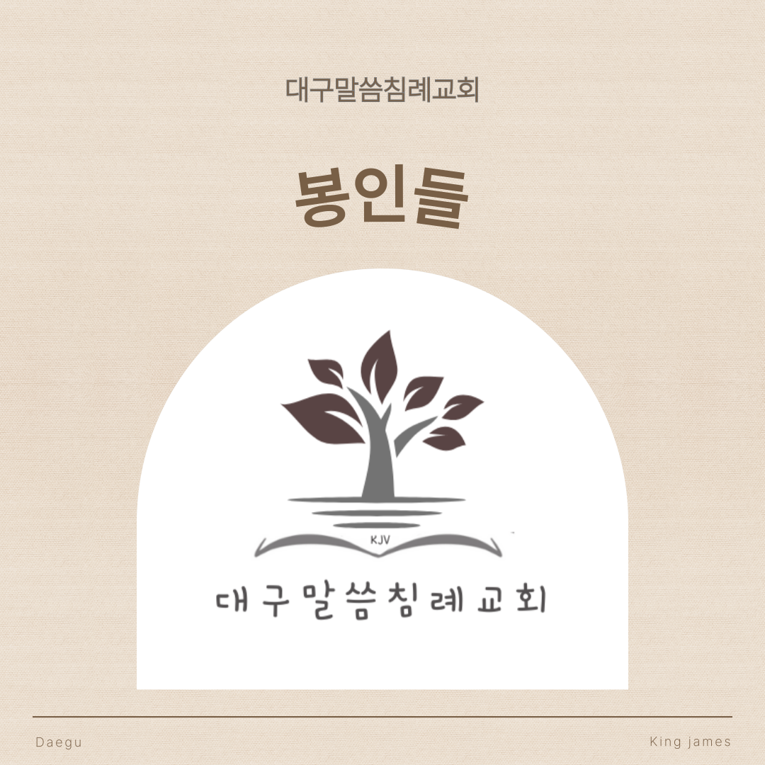 대구말씀침례교회 토요 성경공부다섯째 봉인 (요한계시록 6장 9절-11절)“다음으로 그분께서 다섯째 봉인을 여셨을 때 [하나님]의 말씀으로 인하여 그리고 자신들이 붙든 증언으로 인하여 살해된 자들의 혼들을 제단 아래에서 내가 보았도다.”(요한계시록 6장 9절)“그러므로 예언자 다니엘에 의하여 언급된 황량하게 하는 그 가증한 것이 성소 안에 서는 것을 너희가 볼 때면, (누구나 읽는 자는 이해할지어다.)”(마태복음 24장 15절)“그리고 군대들이 그의 편에 서리니 그들은 힘의 성소를 오염시킬 것이요, 매일의 희생 제물을 제거하리라. 그리고 그들은 황량하게 만드는 가증함을 두리라.”(다니엘 11장 31절)“그는 대적하는 자요, [하나님]이라고 불리거나 경배를 받는 모든 것 위로 자기 자신을 크게 높이는 자니라..