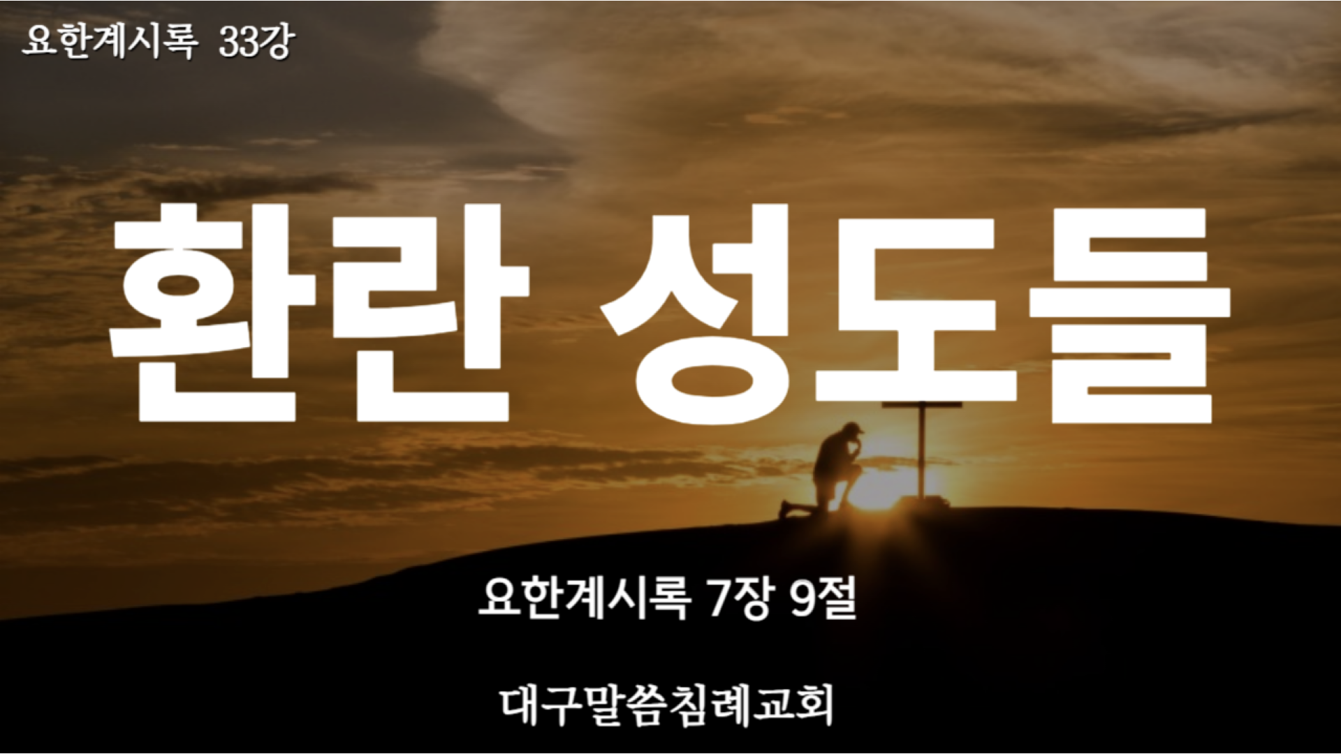 - “그런즉 내가 그에게 말하기를, “선생님, 당신께서 아시나이다.” 하였더라. 그러자 그가 나에게 이같이 말하였더라. “이들은 대환란에서 나온 자들이요, 그들의 예복들을 어린양의 피로 씻어 그것들을 희게 하였도다.”(요한계시록 7장 14절)